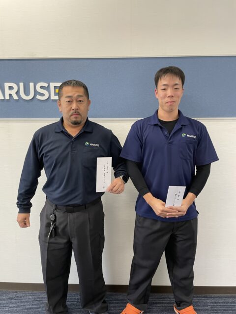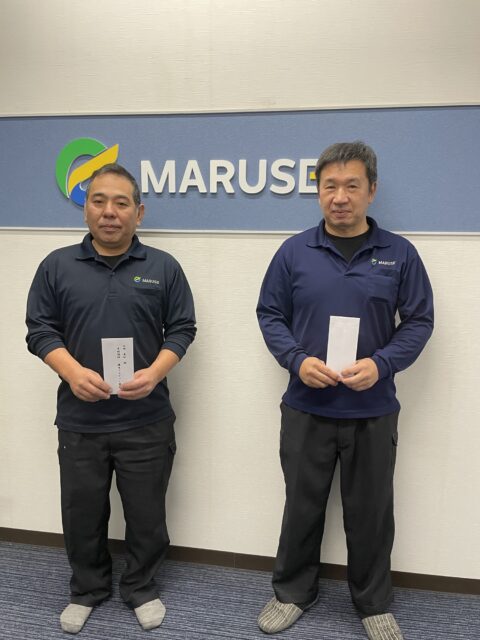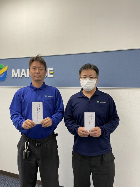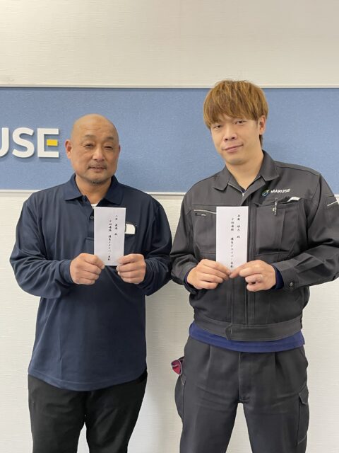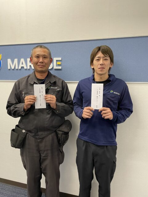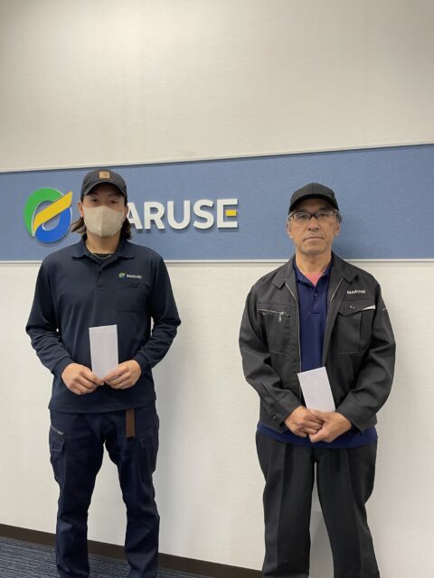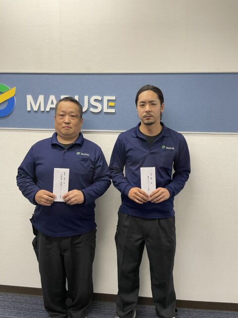 長距離ドライバーさん(右)は日々の燃費削減で試行錯誤した結果初めての表彰です♪弊社は努力が形として評価されます!!